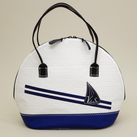 - Sac à main en forme de Coquille Blanc/bleu marine Voile blanche, décorations bleues marine, Anses en sangles pliées cousue façon maroquinerie, porté main, Fermeture zippée, Base: 30 cm X 14 cm, Hauteur: 29 cm.En stock