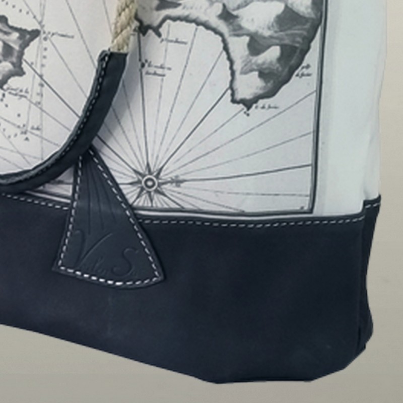 Cabas de ville en ancienne de bateau imprimée carte ancienne de St Tropez et cuir Anthracite,