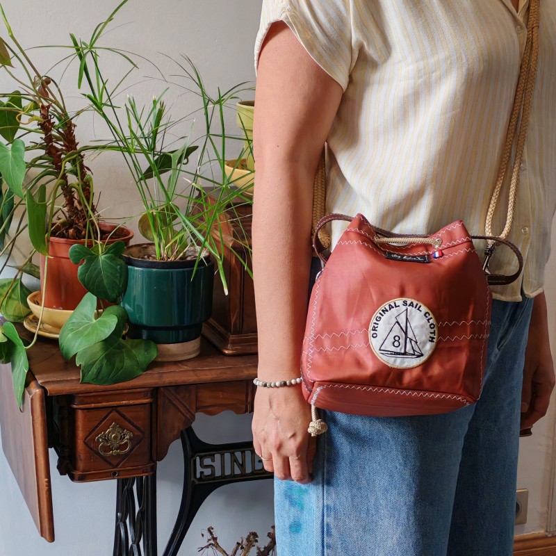 Cabas en voile de bateau recyclée burgundy base rectangulaire. Voile utilisée pour les ancien voiliers de travail comme le thoniers. Série limité je n'ai qu'une voile de cette couleur! Chaque modèle est unique! Renforts des coins en cuir de vachette utilisé pour la fabrication des gants de pompier, Ecusson "Original Sail Cloth" Brodé,